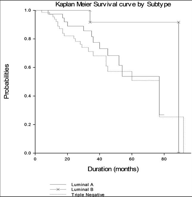 The Kaplan-Meier curve for overall survival by tumor subtype is shown in Figure 1. Subjects with the triple negative subtype, ER/PR and HER2-neagive, had the worst overall survival of 50.80% as compared with the other subtypes. Subjects in Luminal B had the best survival of 84.42% (Table 2).