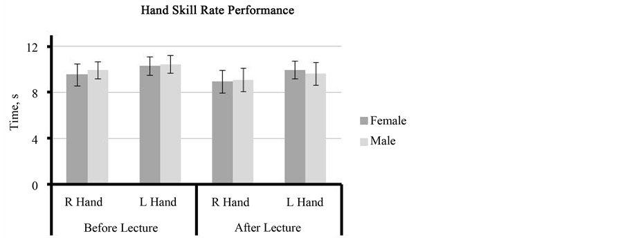 Introduction: Determination of hand skill rate is thought to be important for the functional evaluation of nervous system. Therefore, hand skill performance monitoring could be a reliable measure for the effect of audio-visual medical teaching on central nervous system. The aim of this study was to evaluate the effect of mental activity on the hand skill rate performance ability following one hour audio-visual medical teaching. Methods: Participants were 34 healthy screened right handed volunteers (19 female, 15 male, age between 18 - 22 years). Hand skill rate performance time was assessed by Annett’s peg moving task. Each participant repeated the task five times in a different time, before and after the lecture. Data were analyzed by statistical software package SPSS. Statistical significance level of p < 0.05 was considered to be significant. Results: Hand skill rate performance time value was not associated with the gender difference. Based on this result, statistical evaluation was performed without gender discrimination (n = 34). When the hand skill rate performance times of each hand were compared with the values obtained before and after lecture, it was found that hand skill rate performance times for both right and left hands were decreased in all subjects after the lecture. Conclusions: This study may suggest that attending an audio-visual medical teaching lecture and performing Annett’s peg moving test may both cause activation in the common areas of nervous system. This activation may lead a state of alertness on the students, which in turn affects hand skill rate performance time in a positive manner. Therefore, we may suggest placing laboratory sessions in the curriculum at least one hour following a theoretical lecture since this may lead to increasing the success and the practicability of the sessions.