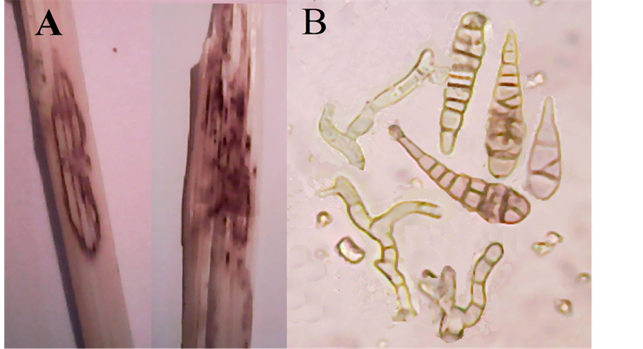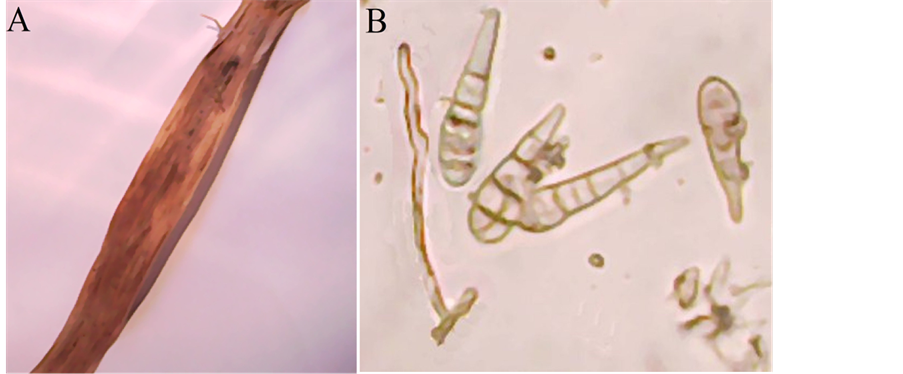 Figure 5. Alternaria triticicola: (A) Elongated necrotic lesions with dark brown margins and brittle margins of the top of leaves; (B) Conidia and conidiophores (×1280).