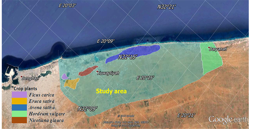 Figure 1. A map of study area showed the crop plant sites in the eastern of Benghazi (Lat: 20˚05'E & 20˚21'E. Lon: 32˚08'N & 32˚21'N).