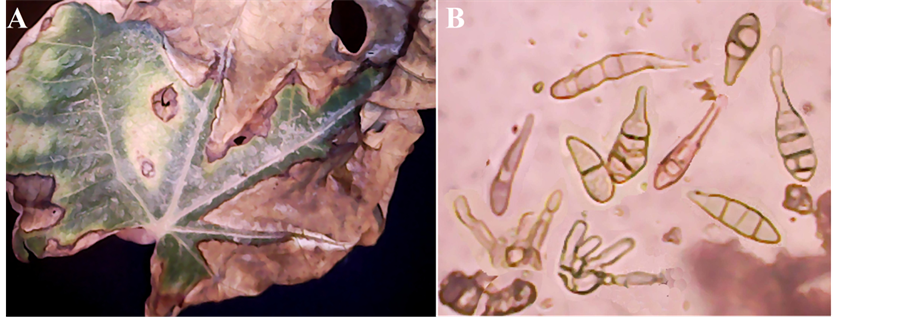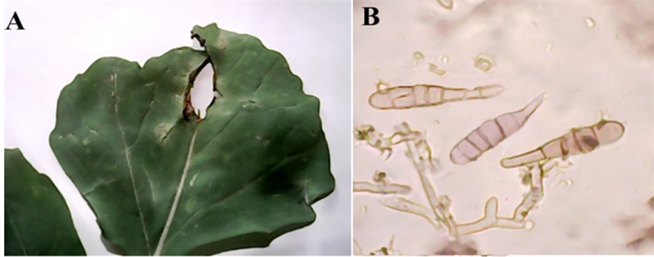 Figure 2. Alternaria brassicae: (A) Dark brown zonate spots on Eruca sativa; (B) Conidia and conidiophores (×1280).