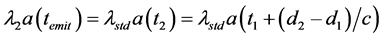 Momentum conservation implies that the wavelength of light remains constant in traveling between any two points. If that is so, the spectra measured at d2 will differ from that observed at d1 only as a result of the changes in the instruments at d2 caused by the general increase in rest masses during the time interval