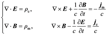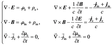 Regarding the originality of magnetic charge, we could go back to the 19th century. At that time Helmholtz used the concept to calculate the force exerted on a “magnetic particle” by electric current [1] . Meanwhile, based on the fact that the magnetic flux across a closed surface was always zero, Maxwell pointed out that no evidence indicated the possible existence of magnetic charge [2] . Nevertheless, a set of symmetrised MEs was first obtained by Heaviside in 1893 [3] , but Heaviside himself didn’t trust magnetic charge. Thus, he called it “fictitious”, and even thought that its sole worth was providing a convenient way to describe electromagnetic phenomena. In 1931, Dirac presented an idea of magnetic monopole to symmetrise Maxwell equations (MEs) as