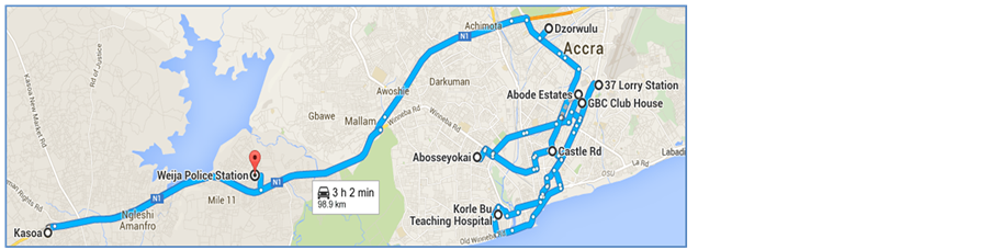 Ten (10) sectional areas in and around Accra Metropolis which is located on latitude 5.56˚N and 0.2˚W with elevation of 91 m [10] were selected for the study. These ten (10) sectional areas include 37/Opeibea, Korle Bu, GBC Frontage, Pig Farm, Abossey Okai, Castle Road, Dworwulu, Kanda, Kasoa and Weija. Figure 1 shows the map of the study areas.