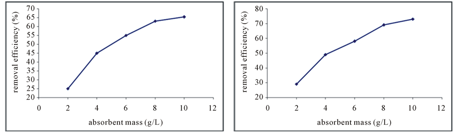To evaluate the effect of absorbent amount on the removal efficiency of the phosphorus solution was prepared in 20 mg/L concentration. Then 100 cc of phosphate reagent was added to 6 Erlenmeyer Flask and pH was adjusted on 5. on the next step 2, 4, 6, 8 and 10 g/L of absorbent were added to each of Erlenmeyer Flask. After adding absorbent, the Erlenmeyer Flasks put on the shaker and were mixed with the 150 rpm for 150 minutes. then the absorbent was removed from the Erlenmeyer Flask by filtration and residual phosphorus concentrations were determined by absorption spectrophotometer, So the optimum absorbent dose was determined.