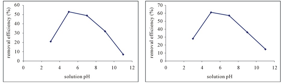 The solution pH is an important factor in the environmental pollutants removing process. In a side the solution pH affect on the ionic species of target pollutants and on the other side change the surface charge of adsorbent by hydrogen ions and hydroxyl bombardment and will affect to removal process [13] - [15] . It can be considered in phosphorus case too. Firstly, adsorbent surface covered with hydrogen positive ions in acidic environments and negative ions in alkali environment and adsorbent surface will saturate by hydroxyl. It can be stated that the second step is the effects of solution pH on phosphorus species in acidic and alkaline conditions, In the acidic conditions (pH 4 and below), dominant species of phosphorus ions are H3PO4 and H2PO4―that will attached weakly to the surface of absorbent and on the alkaline conditions (higher than pH 8) dominant species are PO4-3 of phosphorus ions. In neutral conditions (pH from 5 to 8) dominant species will be HPO4-2 ions that will attached to absorbent [16] [17] . In the present study showed that removal efficiency increases with increasing solution pH from 2 to 6, the reason is that in acidic conditions (pH = 2) dominant species of phosphoric acid are (H3PO4 and H2PO4-ions) which reduces the efficiency of removal process. By increasing the pH to about 5 - 7 dominant ions are HPO4-2 which cause a strong link with the absorbent and thus the removal efficiency in this range of pH (pH = 5 in this study) reaches its maximum rate. Also the removal efficiency decreased with increasing pH from 6 to 10. This is due to the presence of PO4-3ions and dominance of hydroxyl negative ions that compete with phosphate ions to adsorb onto the absorbent and reduces the efficiency of process. In this study, the best removal efficiency was at pH 5, which for raw red soil equal to 53% and 61% for the red soil that amended with EDTA. In most studies that have been done, the maximum phosphorus removal has been reported in the range of pH 5 to 7.