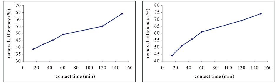 The results showed that phosphorus removal efficiency increases with increasing contact time. The removal rate are 45% for raw red soil absorbent in 60 min contact time. aw red soil was determined that removal of contact time of 60 minutes is equal to 45%, but by 150 minutes contact time, 60% of phosphorus concentration were eliminated (Figure 2(a)). The removal rate of red soil absorbent amended by EDTA in a 15-minute contact time was 40 percent. By increasing the contact time to 150 minutes the average removal rate was 72 percent (Figure 2(b)).