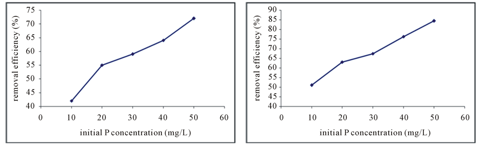 Figure 3. The effect of initial phosphorus concentration on the removal efficiency of phosphorus by the absorbent, raw red soil (a) and modified absorbent (b).