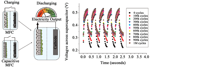 Figure 4. (a) Capacitive behavior of bacteria in MFCs; and (b) charging/discharging of the MFC-based supercapacitor up to 1,000,000 cycles [31] .