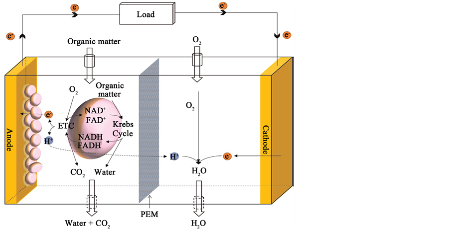 The use of microorganisms in fuel cell as a catalyst for electricity generation was known 40 years ago [29] . When micro-organisms consume a substrate such as sugar in aerobic conditions they produce carbon dioxide and water, while when oxygen is not present they produce carbon dioxide, protons and electrons: