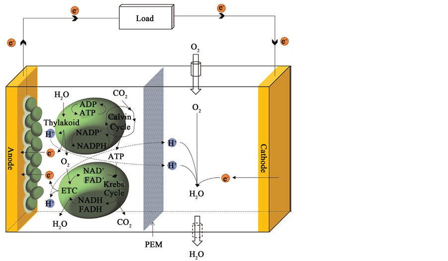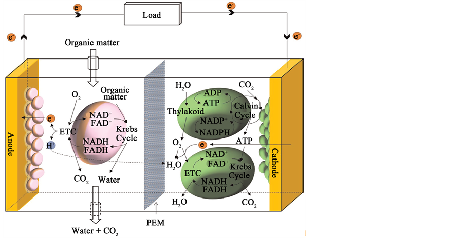 In a dual-chamber MFC described in (Figure 3), the cathode half-cell is operated with photosynthetic micro-