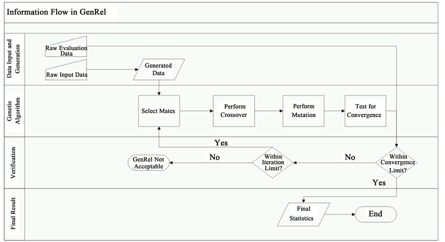 In a typical genetic algorithm, variables of interest are coded. Afterwards, the processes of mate selection, crossover, and mutation are repeated until the fitness function yields desired values [8]. The application of GAs to GenRel is illustrated in Figure 1.