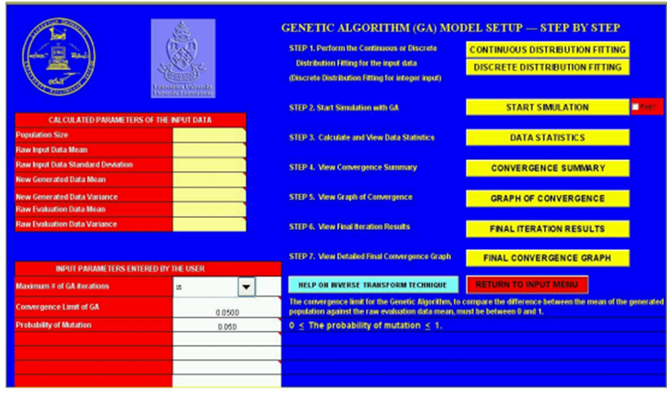 In Microsoft® Excel® with Visual Basic, there isn’t a built-in Poisson inverse function that can directly be called to generate random variables from the best fitted normal distribution with location parameter Lambda. A Poisson inverse function has been programmed in GenRel to complete this procedure, see [28]. GenRel produces six sets of data with size identical to that of the Raw Input Data set. These six sets of data generated through the inverse transform statistical technique constitute the initial population for the cross-over and mutation operations to follow.