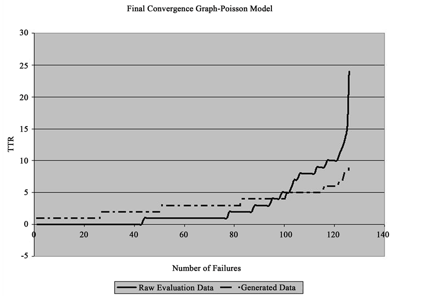 In the case of discrete probability distribution fitting, after one iteration, GenRel returns a set of TTR data as the final prediction of failures for the hoist system at Mine A during the time period from April 1st to June 30th, 2007. Results from @Risk® show that the Poisson probability distribution best fits the predicted data set. The parameter of the Poisson probability distribution is Lambda = 4.5203.