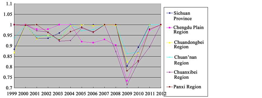 A comparison of the change patterns of the overall input-output efficiency ratios in different land-use regions (Figure 1) shows that there are also obvious disparities between these change patterns. In the case of the land- use region of Chengdu Plain, its overall input-output efficiency ratio apparently tended to fall between 2005 and 2009, but rose again between 2010 and 2012. The overall input-output efficiency ratio of Panxi Region started to drop in 2008 until it reached its lowest in 2009, but also rose again between 2010 and 2012. Generally speaking, in the land-use regions of Chuandongbei, Chuan’nan and Chuanxibei, their overall input-output efficiency ratios did not vary greatly. However, there was still a marked drop in 2009 in these three regions which resulted in comparatively low efficiency ratios in 2010.