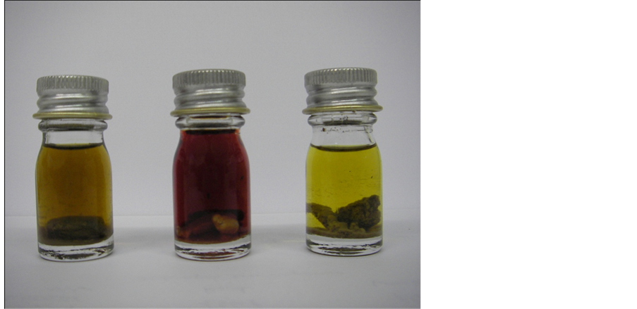 Figure 1. Brown, red and green propolis alcoholic extracts showing the respective colorations.