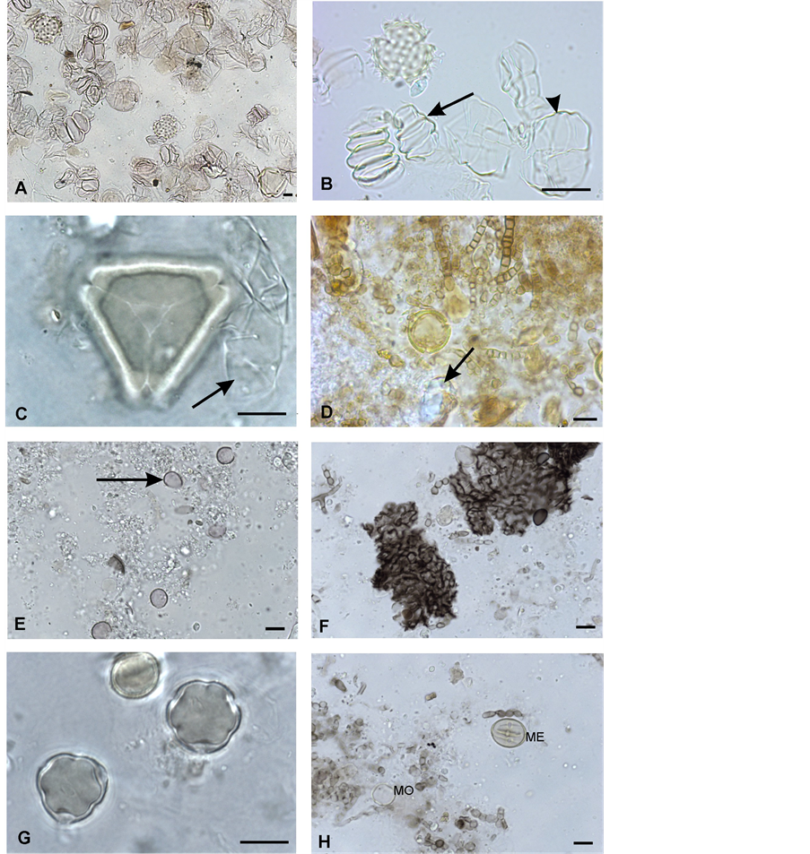 Figure 3. Propolis samples: A. glandular trichomes and pollen grains; B. pollen grain of Aste- raceae and trichomes (trichome head = arrow head, trichome stalk = arrow); C. pollen grain of Eucalyptus and trichome (arrow). Geopropolis samples; D. pollen grain of Alchornea (Euphor- biaceae), spores of fungi and a translucent mineral particle (arrow); E. pollen grain of Piper (arrow) and sand; F. plant tissue, hyphae and spores of fungi; G. pollen grains of Melastomataceae; H. shows pollen grain of Meliaceae (ME) and Moraceae (MO) and fungi spores. Bar = 10 µm.