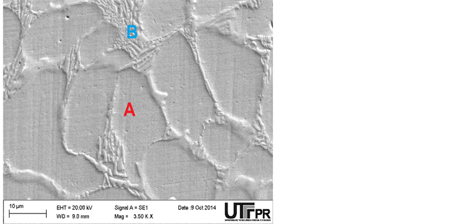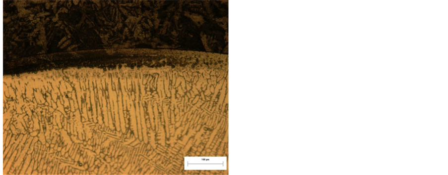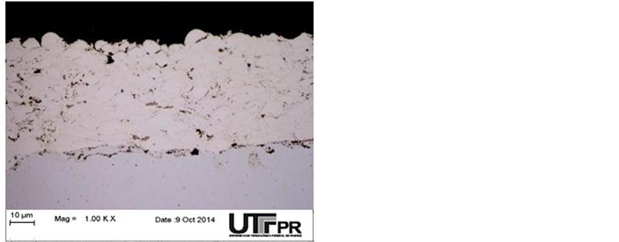 The grain sizes were valued according to ASTM E-112, but the hardness measurements were performed on the sample cross-section, a hardness equipment HV 1000B throughout the coating. The dilution was effected by macroscopic measurements of the value of the areas of penetration and strengthening the deposit as [6] . However, the heat input for this deposition abided between 200˚C and 350˚C as reported [7] , which is responsible for