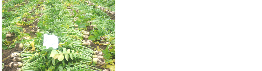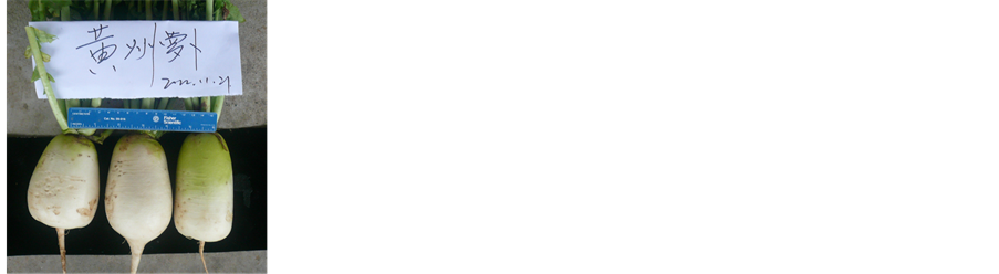 According to seed germination rate and root length of seedlings, the half lethal dose of EMS was 0.4% - 0.8% for Huangzhou radish. So we used the 0.5% EMS mutation for a large number of Huangzhou radish seeds before sowing to field. Then the agronomic characters of Huangzhou radish treated by 0.5% EMS mutation were observed in continuation. We found numerous variations in a large number of mutants in Huangzhou radish. Taproots of Huangzhou were the focus of our study. The foundation of taproots of Huangzhou radish was originally flat at the bottom which showed an inverted triangle cone. After mutation, most taproots of Huangzhou were longer and thicker in contrast to normal Huangzhou (Figure 2). These variations were not the purpose of our original intention of mutation on Huangzhou radish. Via mutagenesis, we had planned to increase the proportion of the original characteristics of Huangzhou radish to obtain high purity of Huangzhou radish. The above test indicated that we obtained a considerable proportion of the Triangular shape and flat bottom of taproots in Huangzhou, while it still needed to be improved.