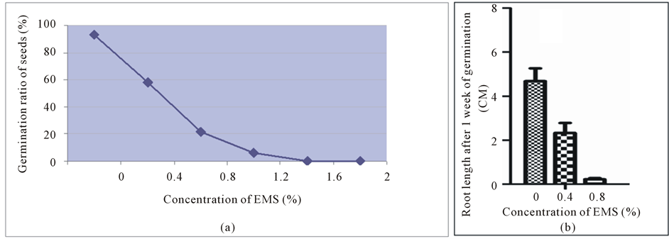 According to the previous study in other crop treated by EMS, we selected 0, 0.2%, 0.4%, 0.6%, 0.8%, 1%, 2% EMS to soak Huangzhou radish seeds, then we measured the percentage of germination of Huangzhou seeds treated by different concentrations of EMS. Statistical results showed that the germination rate of Huangzhou radish seeds showed a gradual downward trend in the range of EMS 0.4% - 2% (Figure 1(a)), and the germination rate in the treatment of 2% EMS was 0.