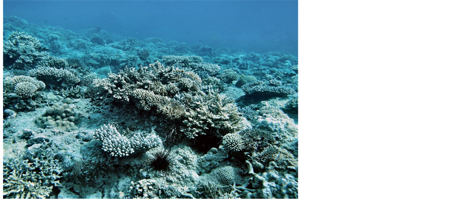 The adjoining structureless reefs’ morphology, degree of development of coral structures, qualitative and quantitative composition of corals is comparable to other Vietnam reefs [5] [16] - [18] . Of 140 - 170 scleractinian species found on these reefs, 47% - 68% are also marked on the reefs of Nha Trang, Con Dao island, the Gulf of Thailand and the Gulf of Tonkin [4] [8] . For small reefs of 70 - 160 m from the shoreline (maximum 200 m), this is quite a high rate of species diversity. Only Acroporidae are represented in 40 species, which makes up 78% of the total composition of these scleractinian on the reefs of the entire Vietnam [8] [19] . The abundance of Acroporidae is an evidence of satisfactory biotic and abiotic conditions on these reefs. These corals are among the first ones to respond to environmental change, especially to anthropogenic pollution and increasing water eutrophication. It is known that in contaminated areas, these corals are absent or very few [6] [20] - [23] . The studied reefs are characterized by explicit bionomic zoning, high species richness and extent of substrate coverage by corals. Participation of various corals in most of the coverage of the surface of the substrate in all zones also confirms the optimal conditions for the formation of these reefs (Figure 3).