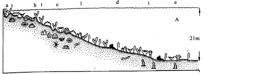 Figure 2. A schematic profile of structureless reef. a―back reef, b―terrace, c―rim reef, d―reef slope, e―for reef platform.