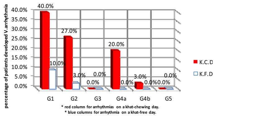 1) The prevalence of ventricular arrhythmias was higher on khat-chewing days in comparison to khat-free days, among all population and in each of cardiac and normal individual groups separately.