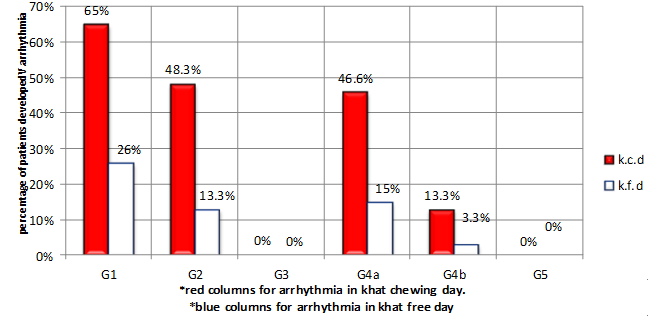 We found that a good correlation occurs between khat chewing and increased incidence of arrhythmias. So, arrhythmias increased significantly on a khat-chewing day in comparison to a khat-free day among all population as in Figure 1 and Table 2 and, at the same time, in both cardiac patients and normal individuals separately, as in Figure 2 and Figure 3.