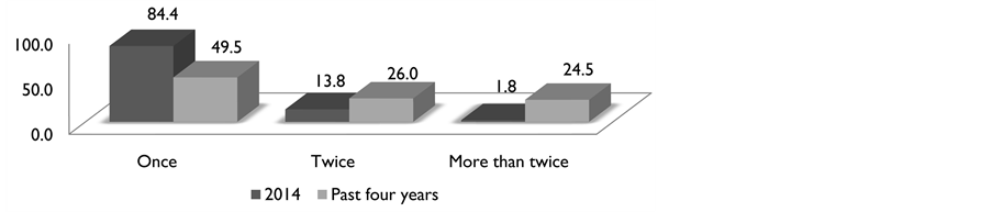 As shown in Figure 1, about 49.5% of responding PPMVs attended the training once in the past four years, 26% attended twice, while 24.5% attended the training more than twice. In 2014 alone, 84.4% attended the training once, 13.8% attended twice, while 1.8% attended more than twice.