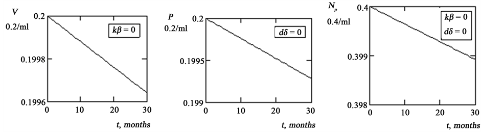 Results from Figures 2(a)-(c), shows that, in 2(a), viral load exhibit inclinatory resilience at early onset of infection having its apex at 2 - 3 months, before declining to V = 0.141 ml, after 30 months of drug administration. For the parasitoid-pathogen as in 2(b), with zero natural death rate, infection decline rapidly and terminating after 24 months of chemotherapy treatment. Overall decline of viruses infected T-cells is put at Np = 0.143 ml.