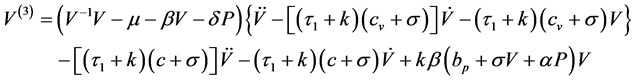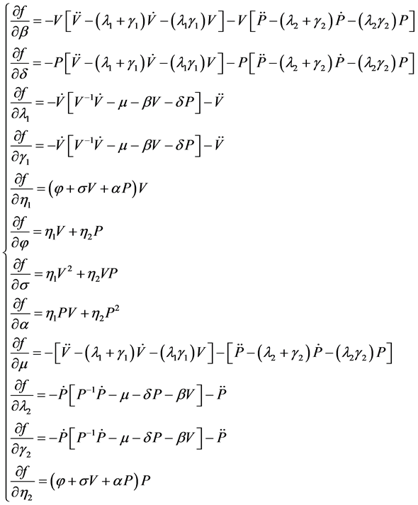 Equation (2.21) is the desired equation, which is solvable if the initial values of the output variables (observables) V and P are known. That is, the identifiable parameters can be evaluated without the need for the unobservable state variables