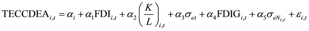 To study impacts of exchange rate volatility and FDI on efficiency in agricultural production, we employ fixed effect model to evaluate impacts of exchange rate volatility (se), FDI, FDIG and sN on variables TECCDEA. The model can be specified as follow: