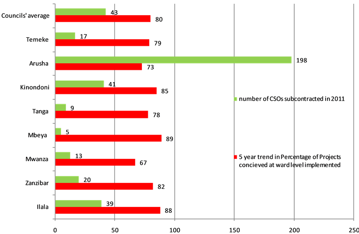 Promoting bottom-up approaches constituted one of the variables of good urban governance. Contextually, the Local Government Authority performance measure requires that at least two wards implement planning from below employing the Opportunities and Obstacles for Development (O & OD) methodology. This measure was also stated even in the Local Government Reform Programme Phase II (LGRP II) in 2009 (PMO-RALG, 2009) . It aimed at Local Government Authorities to derive their legitimacy from services provided to the people (LGRP II, 2009). It also aimed at fostering participatory development and building institutions that reflected local demands and conditions. Examining cities’ response in implementing projects from below, results showed that cities were performing well in responding to proposals and plans from lower levels of local government. On average, 80 per cent of plans/projects implemented were planned from lower levels; at wards and sub-wards. However, there were variations across cities and municipalities. While Mbeya recorded the highest average of 89 per cent, the lowest was recorded in Mwanza that had only 67 per cent (Table 2).
