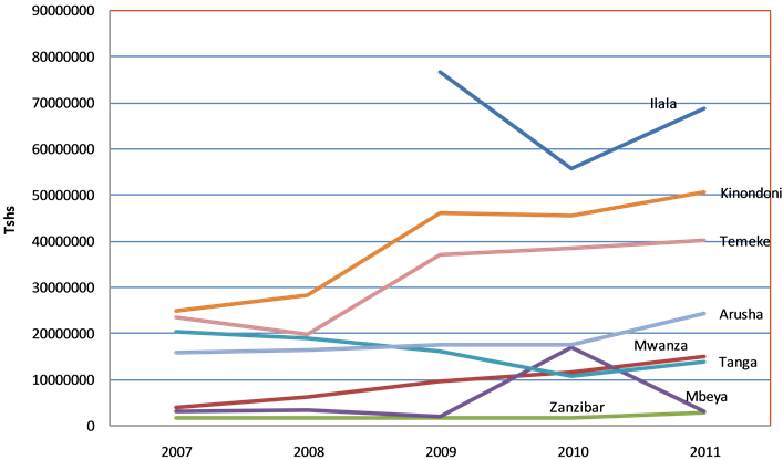 In terms of trends in disbursement of funds, a steady trend was observed in the municipalities of Kinondoni, Temeke and Arusha. Other cities and municipalities had either constant or fluctuating patterns of funds disbursed to ward levels as indicated in Figure 7.