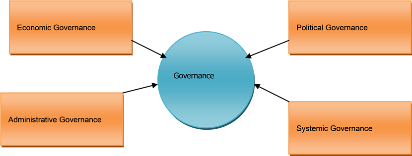 While economic governance refers to processes of decision making that directly affect countries’ economic activities or its relationship with other economies, administrative governance is a system of policy implementation carried out through an efficient, independent, countable and open public sector (Cheema, 1997) . Cheema further observes that economic governance has a major influence on societal issues such as equity, poverty and