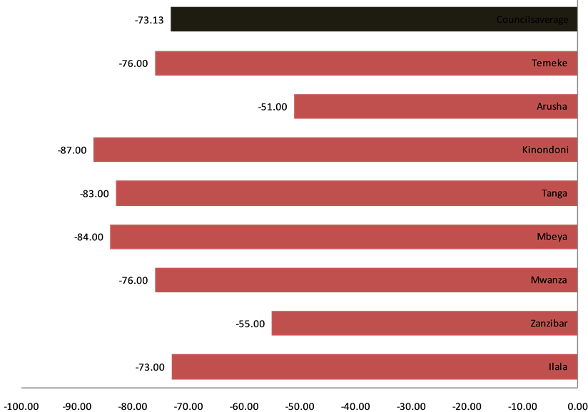 Although one of the criteria for urban settlements to attain the status of a municipality is to collect 70 per cent or above of their revenue from their own sources, the majority of cities and municipalities in Tanzania were still dependent on central government financing. They were dependent for development projects, personnel emoluments and recurrent expenditures. Evidence from field results indicated that on average, the proportion of funds received from the central government in relation to the total budget of a urban local authorities stood at 73.13 per cent (Figure 4). The negative sign denoted dependence. Kinondoni was leading with a total dependence of 87 percent followed by Mbeya that was dependent by 84 percent. The least dependent were arusha and Zanzibar that registered dependence ratios of 51 and 55 percent respectively. The dependence on central government financing not only undermined the primary objectives of decentralization by devolution but also incapacitated cities and municipalities in reaching their maturity in terms of financial sustainability. Overdependence on central government financing undermined the whole idea of enabling cities and municipalities autonomous and the overall goal of good urban governance. In this aspect, one could say that the Tanzania’s experiment of decentralization has proved failure in terms of fiscal independence.