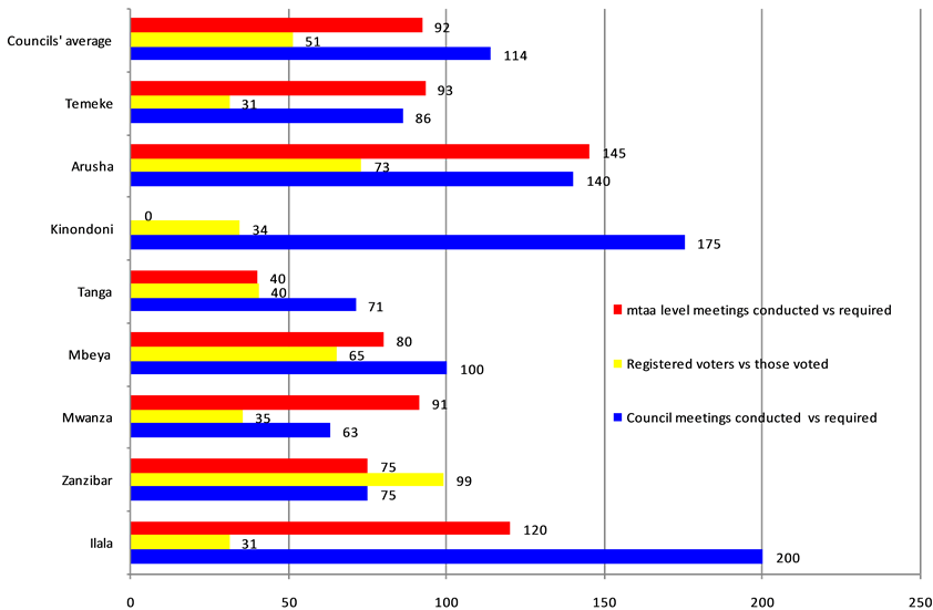 pality held double the required number of council meetings, Mwanza City Council conducted 63 per cent of the required meetings, or approximately two full council meetings or seven finance and administration meetings. Variations across cities and municipalities were reported to be as follows: Zanzibar 75 per cent, Mbeya 100 per cent, Tanga 71 per cent, Kinondoni 175 per cent, Arusha 140 per cent and Temeke 86 per cent. Implicitly, the lesser the number of meetings indicated limited transparency and accountability to the people (Figure 5).