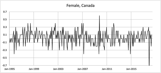 One can note (Table 2) that for both underlying states, the standard deviation of both males and females monthly employment rates is large relative to the mean monthly change. This is indicative of the volatility observed in the previous graphs (Figure 1) of monthly employment changes. In state 1, the means of monthly changes are negative (with the exception of Canadian females) indicating the employment rate is decreasing. The mean of zero for Canadian females is indicative of a random walk. In state 2, the mean monthly changes are all positive, indicating increasing employment for both males and females in both countries.