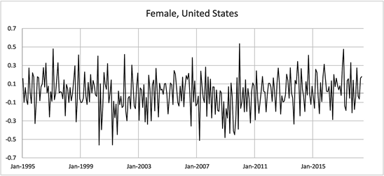 All graphs indicate periods of both increasing and decreasing trends in employment rates for males and females in both countries. The following Graphs (Figure 1) are the changes in monthly employment rates for males and females in both countries.