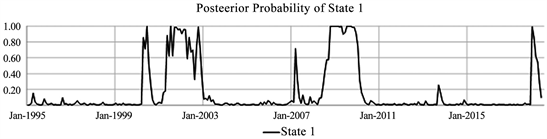 In a Hidden Markov model one is interested in determining the underlying hidden state at each point in time suggested by the data. The following graph (Figure 2) plots the posterior probability of being in state 1 (the probability of being state 2 is just 1-the probability of being in state 1).