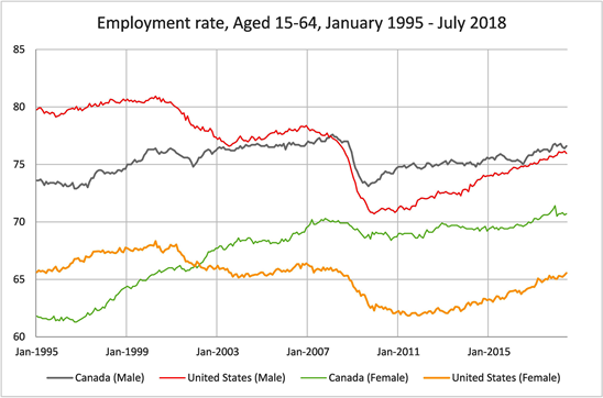 Figure 3. Employment rates for Canada and the United States for males and females in the age group 15 - 64.