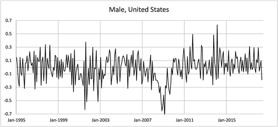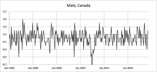 The measure used in this study was monthly rate of employment for each of Canadian and USA males and females as reported in the OECD database.