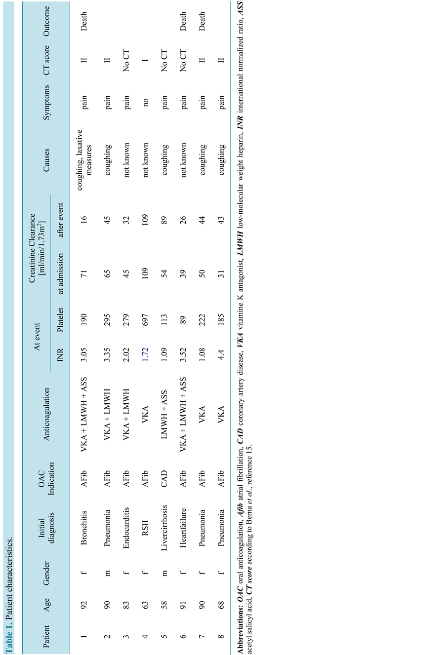 Our case series shows a substantial mortality (38%; 3 out of 8 patients) and morbidity of RSH in an unselected group of medical inpatients in a general hospital. Mortality rates vary in different reports between 0% [8] and 20% [5] . To date the largest series was reported by Cherry et al. in 2006 [3] . They found a mortality rate of 1.6% (2/126 patients). Their patients were younger than in our report (mean age 67.9 vs. 79.4 years). One patient had a coagulation disorder (hemophilia A) and the other had a sustained bleeding despite optimal hemostatic treatment with fatal outcome. The high mortality in our report is—to our opinion—caused by the small sample size, the higher age of our patients with RSH, relevant comorbidities like chronic renal failure, use of bridging therapy and patients who did not wish to receive renal replacement therapy or treatment on an ICU. In our series, ASA therapy was stopped at least one week before the bleeding event in 2 of the 3 patients. One patient had ASA, a mild thrombocytopenia and liver cirrhosis stage Child A with a preserved coagulation and no OAC. In one study, the combination of ASA and LMWH was considered as problematic due to the prolonged pharmacological action leading in this study to more interventional treatment [9] . One could postulate that the use of the combination of OAC and inhibition of platelet function might be associated with an increase of RSH. We could not find any reports to support this postulate.