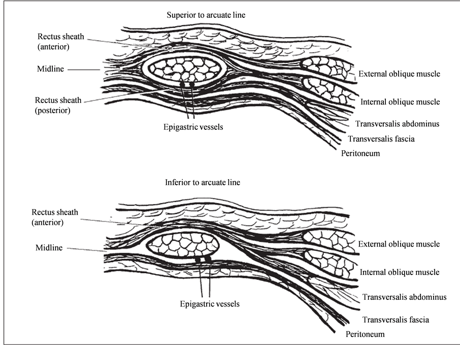 Figure 2. From Edlow JA et al. [13] with kind permission of Elsevier Limited provided by Copyright Clearance Center. Upper image shows the rectus sheath anatomy above the arcuate line with posterior protection of the epigastric vessels which is formed by the aponeurosis of muscle fibers of the internal oblique and the transversalis abdominus muscle and the transversal fascia. In the lower image, the posterior rectus sheath is missing, leaving the epigastric vessels unprotected. A bleeding at this site can extend to the pelvis and can cause severe loss of blood.