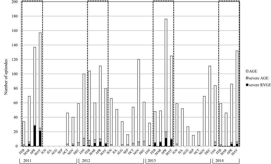Figure 1. Monthly number of episodes of AGE, severe AGE, and severe RVGE (<3 years of age). Number of AGE (pale gray column), severe AGE (gray column) and severe RVGE (black column) episodes are indicated throughout the study periods. Severe RVGE episodes include only test confirmed episodes. Dotted squares indicate epidemic seasons. In 2011, the study was performed in only the epidemic months from February to May and the months from October to December. The peak month of severe RVGE was April in each year.