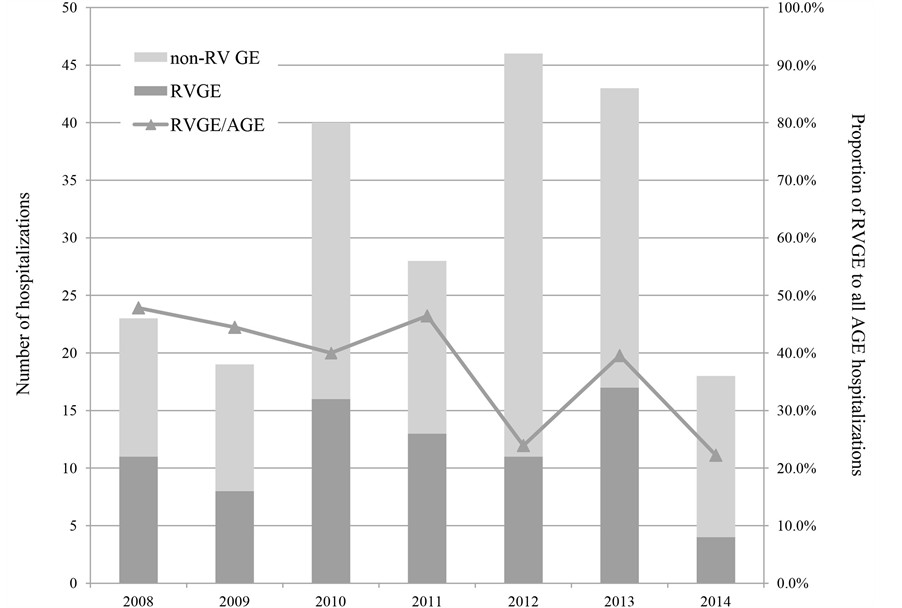 The number of children younger than 3 years of age who lived in Shibata City and hospitalized in the Shibata Hospital due to RVGE and AGE was retrospectively collected for reference of long-term trends. Figure 2 indicates numbers of hospitalizations due to RVGE and non-RV GE by year. The proportion of RVGE among AGE was 26.9% in the period after RV vaccine introduction (from January 2012 to May 2014), significantly lower (p = 0.018) compared with 44.7% in the period before (from January 2008 to December 2011). Although year-to- year variation was seen in numbers of hospitalizations due to RVGE and AGE, the proportion of RVGE among AGE reduced after RV vaccine introduction.