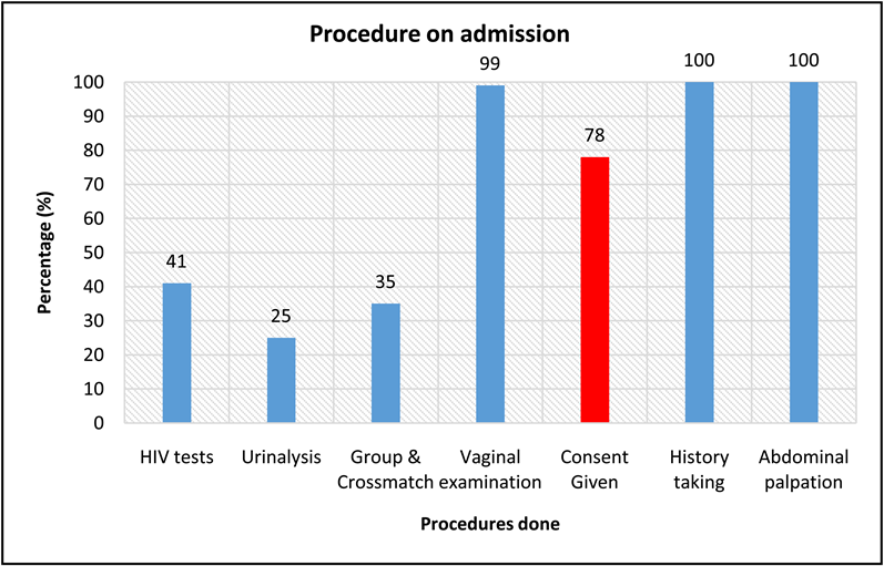 The study examined the frequency of consented care at admission based on the procedures that the women received at admission (Figure 2). Overall, majority of the respondents, 119 (78%) reported to have consented while the rest,
