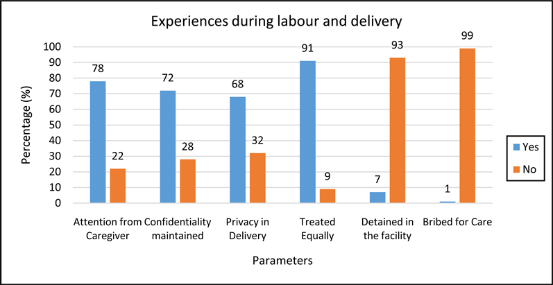 During labor and delivery, Majority of the respondents, 109 (72%) reported that while receiving care their confidentiality was maintained while 43 (28%) of the respondents reported that their confidentiality was not maintained during labor and delivery (Figure 7).