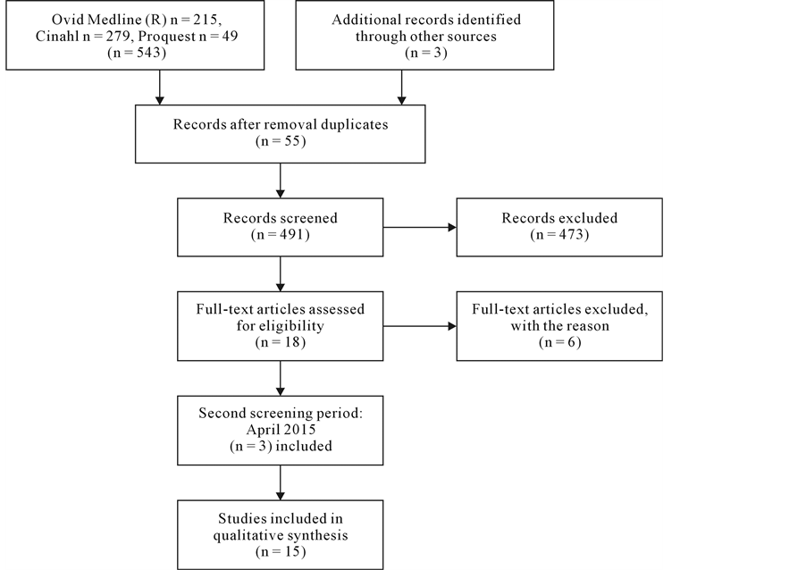 The first author recruited a specialized librarian to discuss the keywords to be used in various databases in order to identify peer-reviewed articles on the topic of interest. The following keywords were selected: consumer participation/or patient participation and safety management/or patient safety in various combinations. In addition, the term qualitative was used to specify the design of articles. The inclusion and exclusion criteria are listed in Table 1. Initially four electronic databases were used, after which the results were discussed and the various hits compared by the authors (Table 2). The first search covered the period from February 2005 to February 2015. In the second stage an additional screening was conducted from February to April 2015, to ensure that all articles that met the criteria were included. A manual search of references in the selected articles was made to identify additional studies (Figure 1, [14] [15] ).