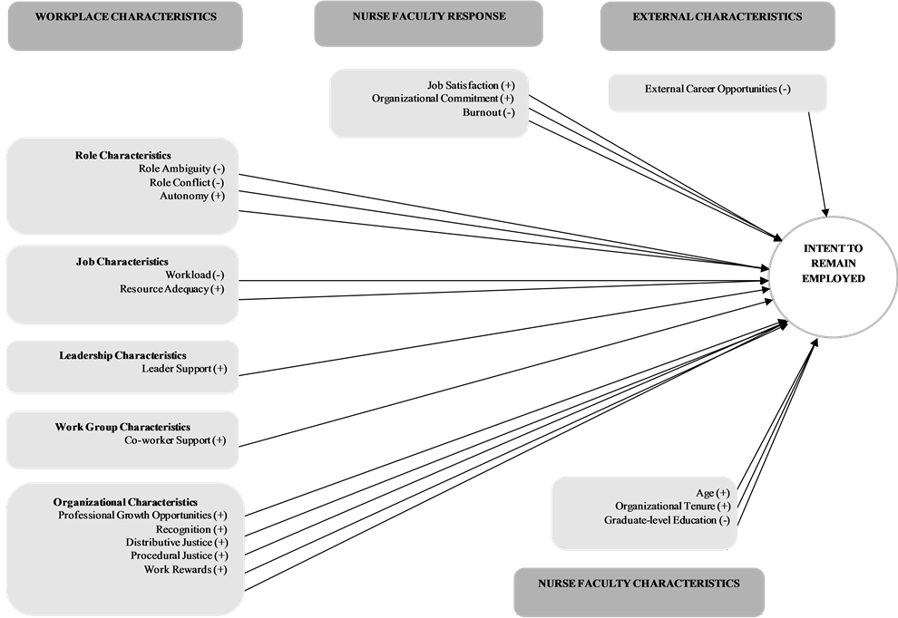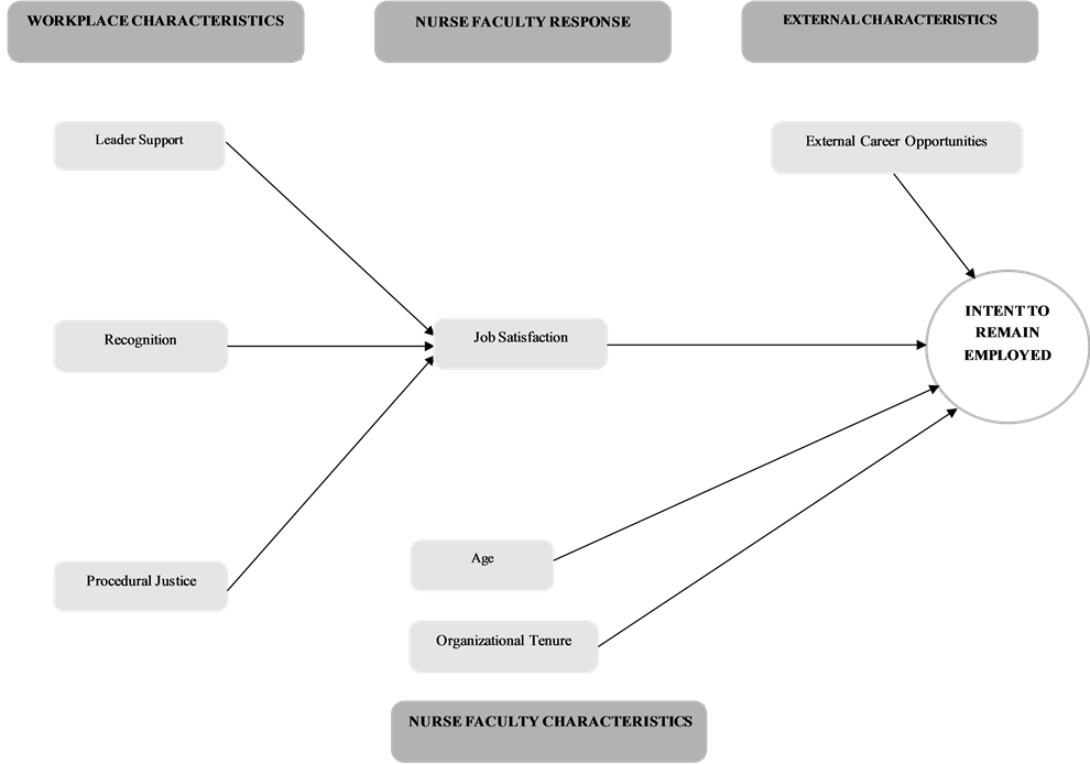 In recent years, more research has focused on identifying the factors that influence nurse faculty intent to remain employed (ITR) in their academic positions. This work is timely given the shortages that continue to impact nursing schools and the profession’s efforts to increase the workforce. As will be evident below, theories and research generated differ in complexity and in identification of predictor variables. Predictor variables are numerous, not tested consistently across studies or conceptualized differently. This makes comparisons challenging. More common among theories is the proposition of ITR being a multi-stage, attitudinal, decisional, and behavioural process [6] . This perspective draws from the seminal work of [7] [8] who developed the model, Theory of Reasoned Action, for the prediction of behavioural intentions and/or actual behaviour. The behavioural component relates to the act of retention. The decisional component describes the intention to act viewed as the direct causal variable through which other variables influence actual retention behaviour [9] [10] . The attitudinal component includes, but is not limited to, job satisfaction and organizational commitment. The main premise of the theory is that behavioural intentions are the direct and most significant determinants of behaviour. Therefore, nurses who intend to remain employed in the organization are likely to remain employed [9] [11] [12] [13] [14] [15] . Several nurse faculty ITR models are briefly described below.
